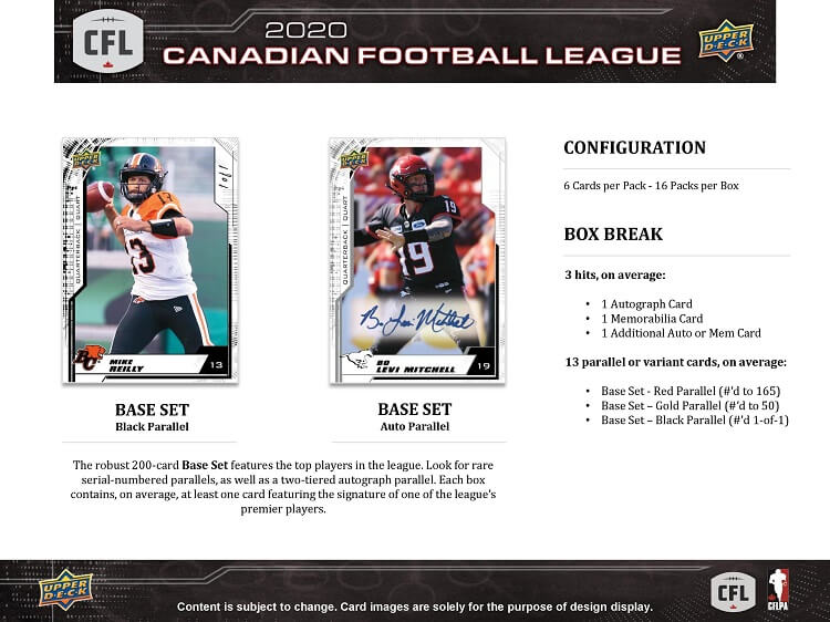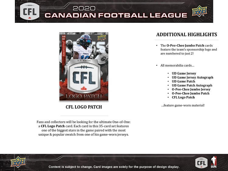 · At least one Memorabilia card can be found in every box, including game-worn jersey and patch cards. Lucky collectors may pull an O-Pee-Chee Jumbo Patch card (#’d to 2) or the ultimate One-of-One -- a CFL Logo Patch card!