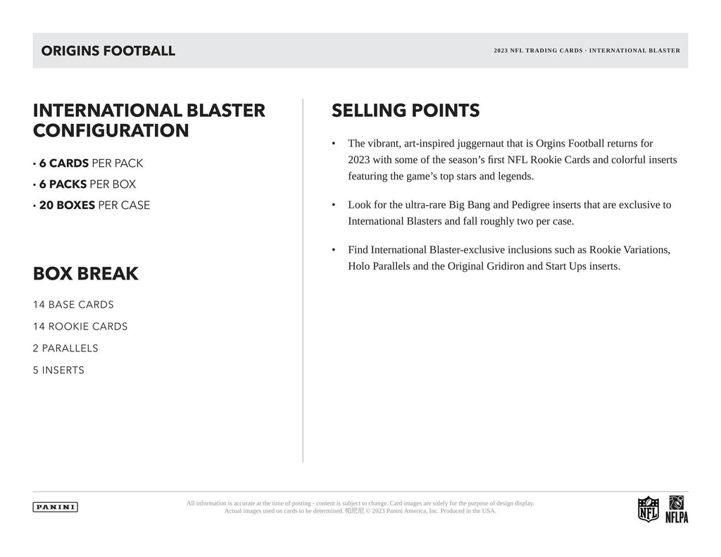 BASE / ROOKIE VARIATION / ROOKIE: The vibrant, art-inspired juggernaut that is Origins Football returns for 2023 with some of the season's most striking NFL Rookie Cards and colorful inserts featuring the game's top stars and legends. Look for International Blaster-exclusive Rookie Variations and Holo parallels.