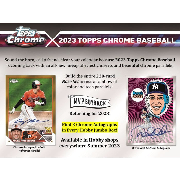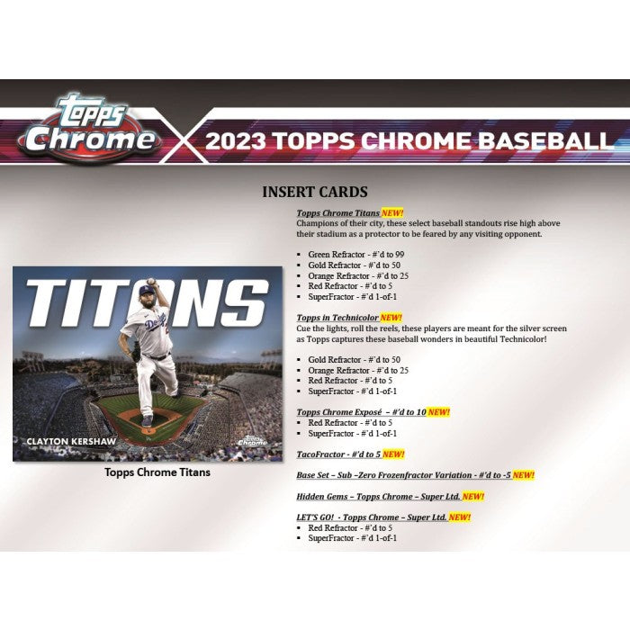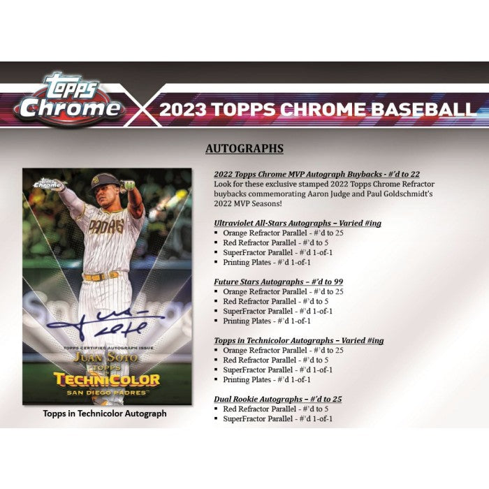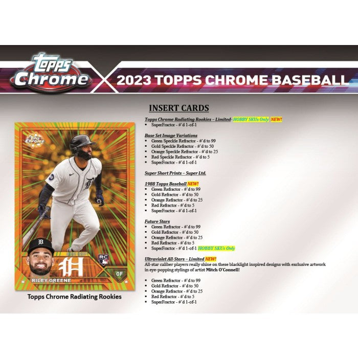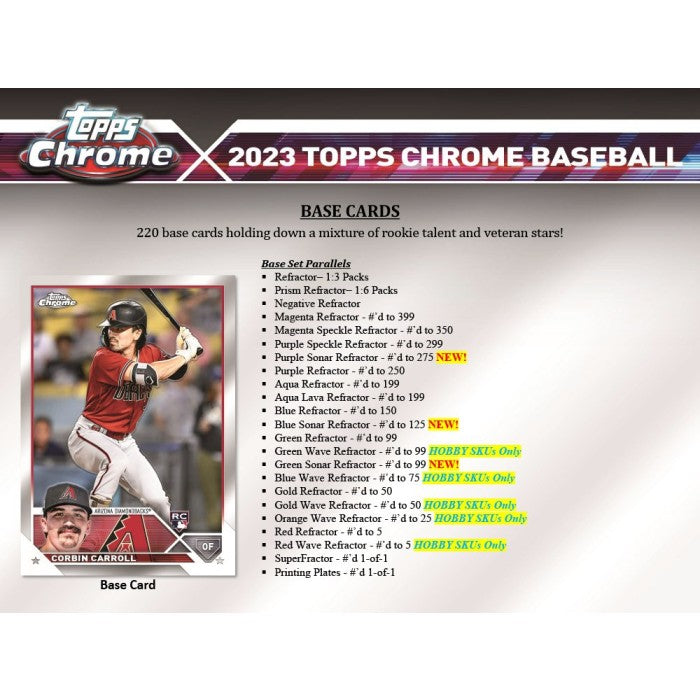 Chaque étui contient une (1) relique authentique Topps Chrome et deux (2) cartes UV All-Star. Chaque boîte contient trois (3) cartes autographes. Chaque pack contient douze (12) cartes de base Topps Chrome Baseball 2023 et une (1) carte de base réfracteur parallèle.