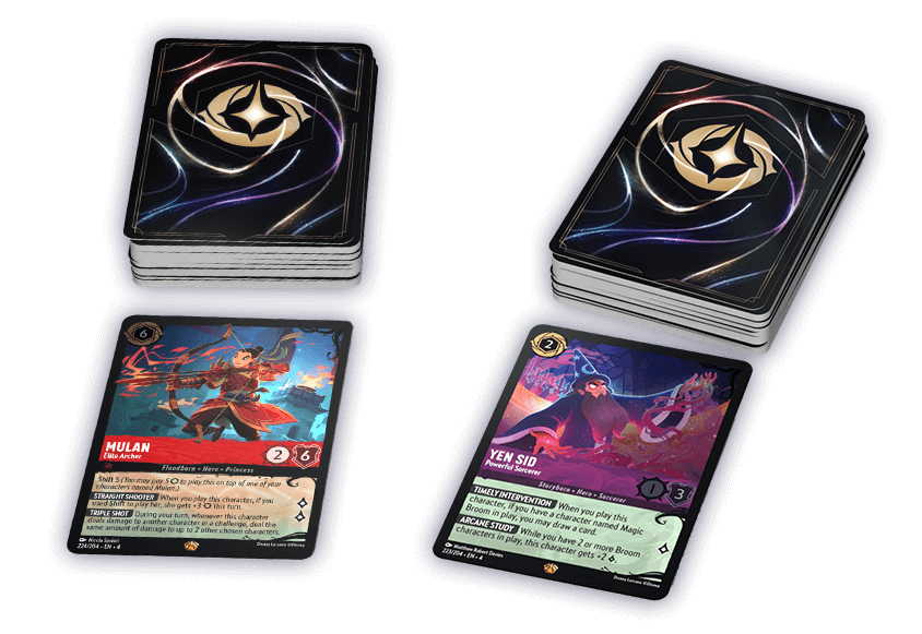 Deep Trouble est livré avec deux decks de joueur préconstruits*, mettant en vedette le sorcier Yen Sid de Disney's Fantasia et le courageux Mulan. Les tours des joueurs se déroulent en même temps, alors coordonnez-vous avec votre équipe, en utilisant les capacités et les effets des lueurs de chacun pour ruiner les plans d'Ursula.